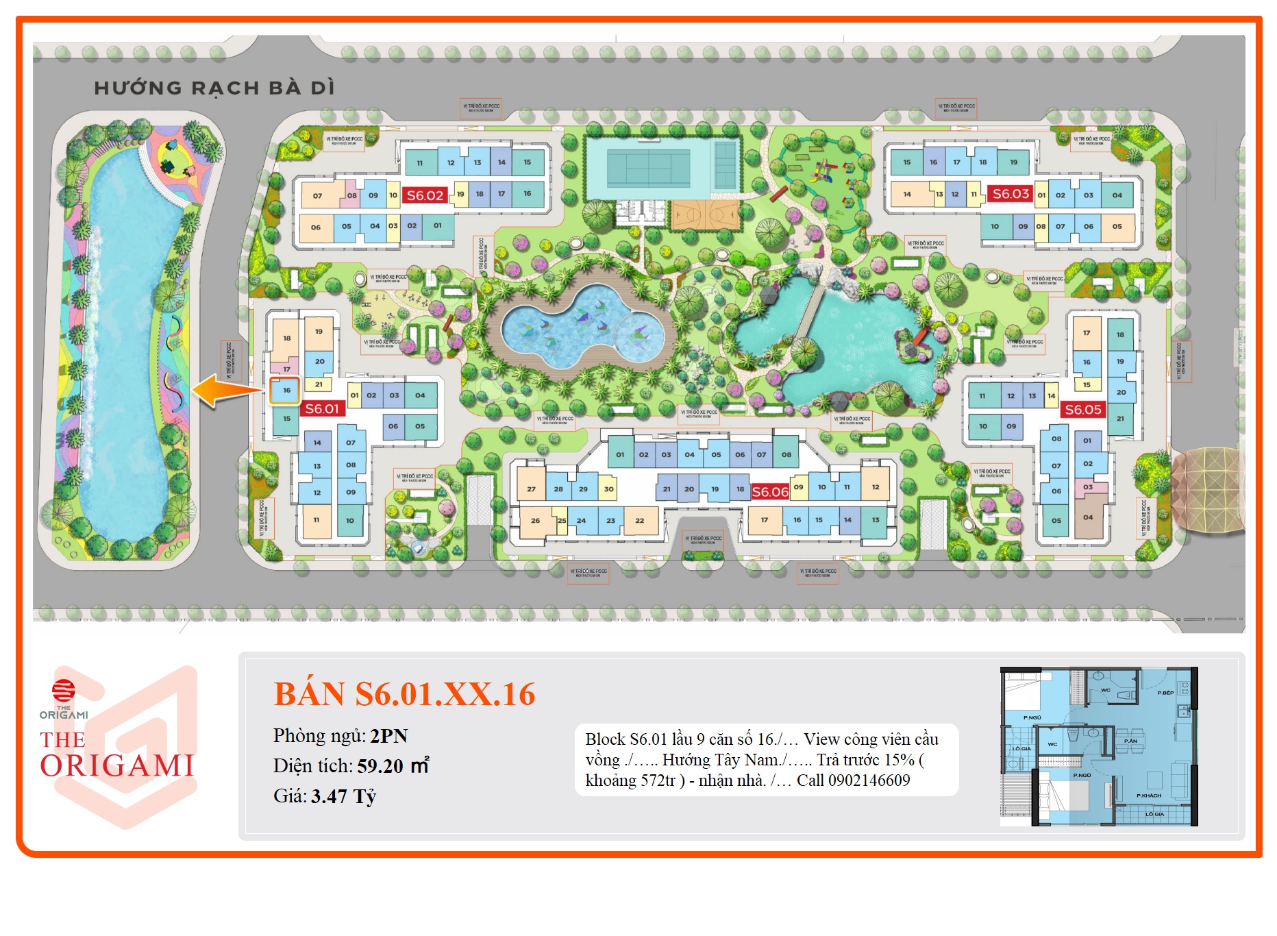 Block S6.01 lầu 9 căn số 16./… View công viên cầu vồng ./….. Hướng Tây Nam./….. Trả trước 15% ( khoảng 572tr ) - nhận nhà. /… Call 0902146609