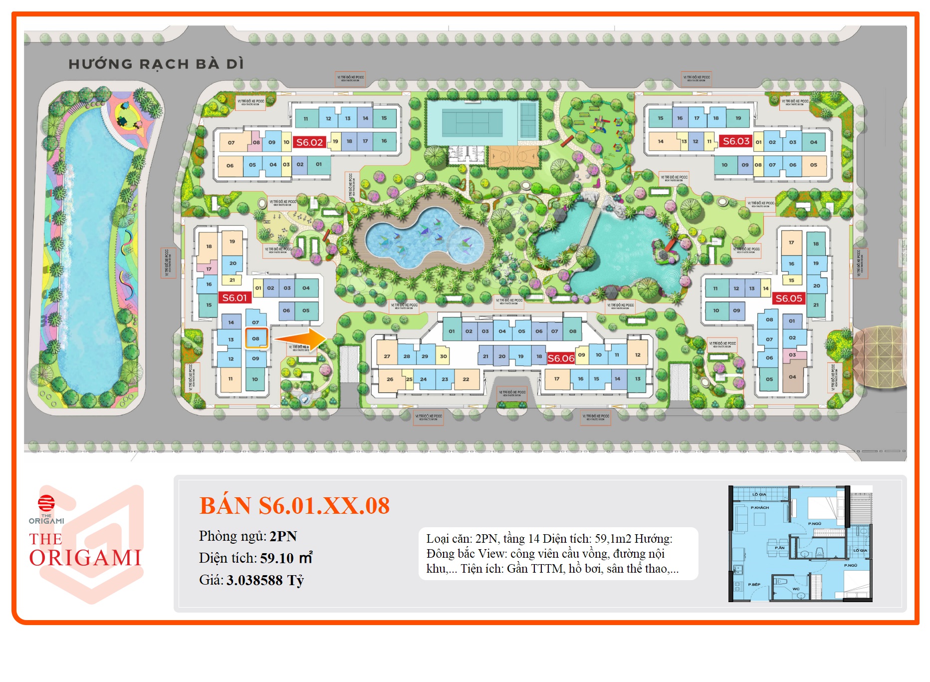 Loại căn: 2PN, tầng 14 Diện tích: 59,1m2 Hướng: Đông bắc View: công viên cầu vồng, đường nội khu,... Tiện ích: Gần TTTM, hồ bơi, sân thể thao,...