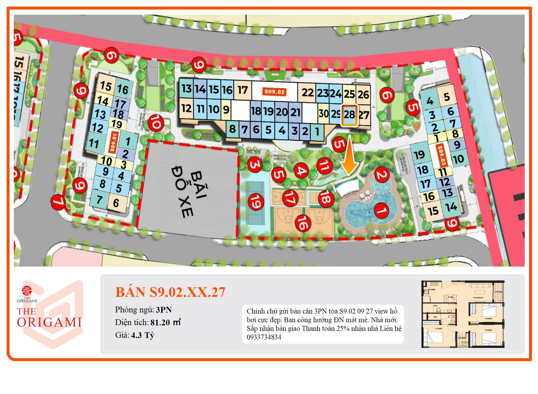 Chính chủ gửi bán căn 3PN tòa S9.02 09 27 view hồ bơi cực đẹp.