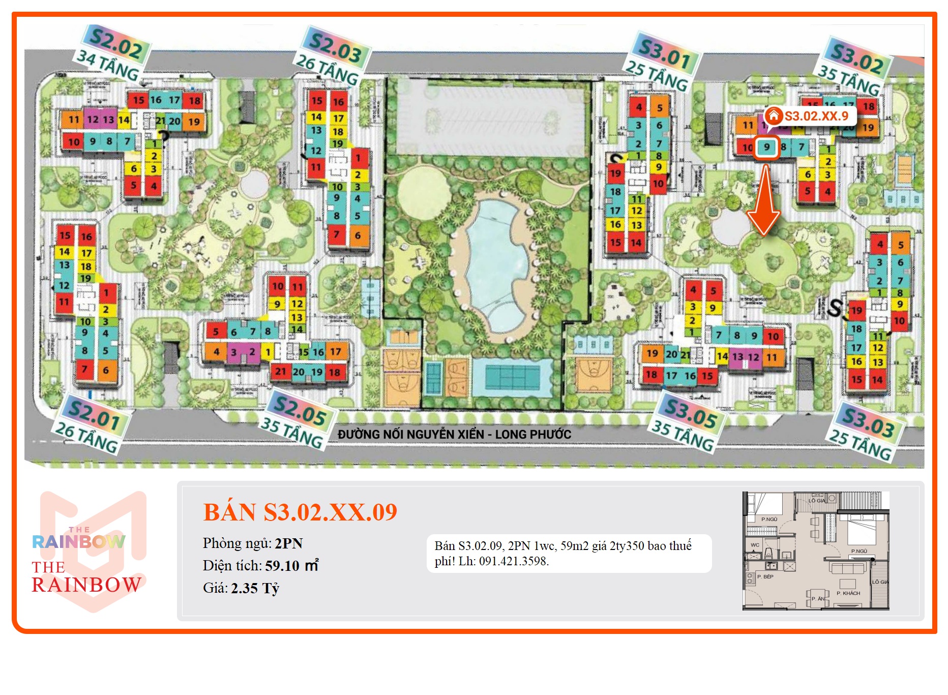 Bán S3.02.09, 2PN 1wc, 59m2 giá 2ty350 bao thuế phí! Lh: 091.421.3598.