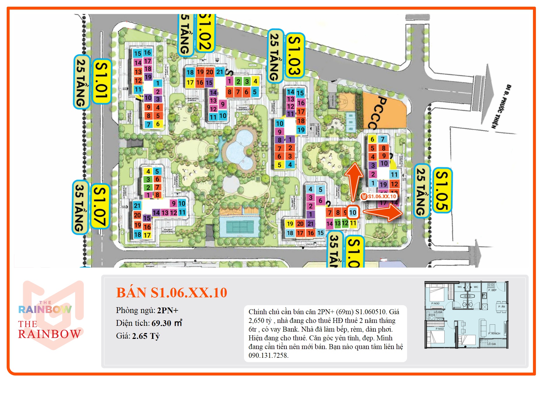 Chính chủ cần bán căn 2PN+ (69m) S1.060510. Giá 2,650 tỷ , nhà đang cho thuê HĐ thuê 2 năm tháng 6tr , có vay Bank. Nhà đã làm bếp, rèm, dàn phơi. Hiện đang cho thuê. Căn góc yên tĩnh, đẹp. Mình đang cần tiền nên mới bán. Bạn nào quan tâm liên hệ 090.131.7258.
