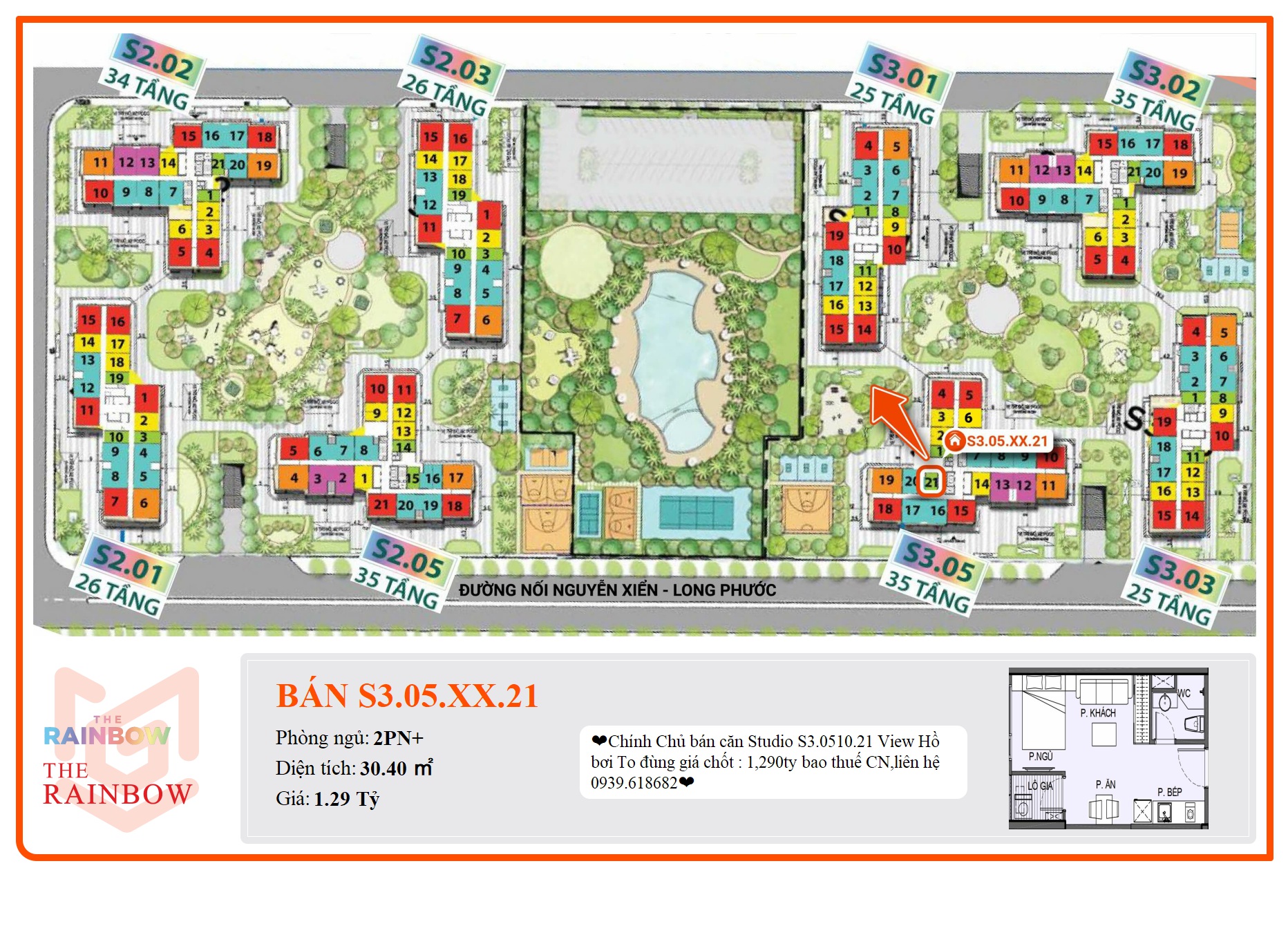 ❤Chính Chủ bán căn Studio S3.0510.21 View Hồ bơi To đùng giá chốt : 1,290ty bao thuế CN,liên hệ 0939.618682❤