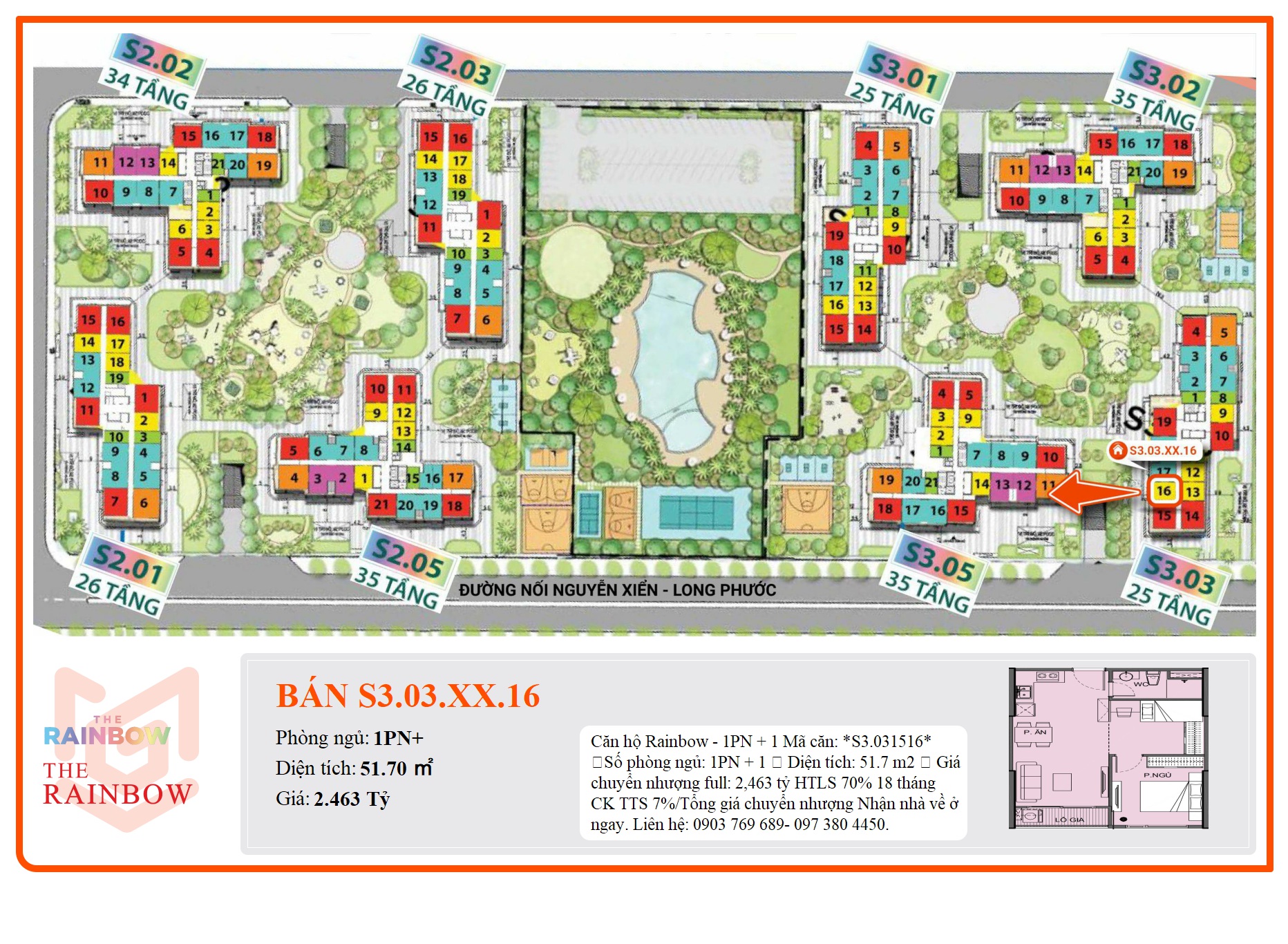 Căn hộ Rainbow - 1PN + 1 Mã căn: *S3.031516* ✅Số phòng ngủ: 1PN + 1 ✅ Diện tích: 51.7 m2 ✅ Giá chuyển nhượng full: 2,463 tỷ HTLS 70% 18 tháng CK TTS 7%/Tổng giá chuyển nhượng Nhận nhà về ở ngay. Liên hệ: 0903 769 689- 097 380 4450.