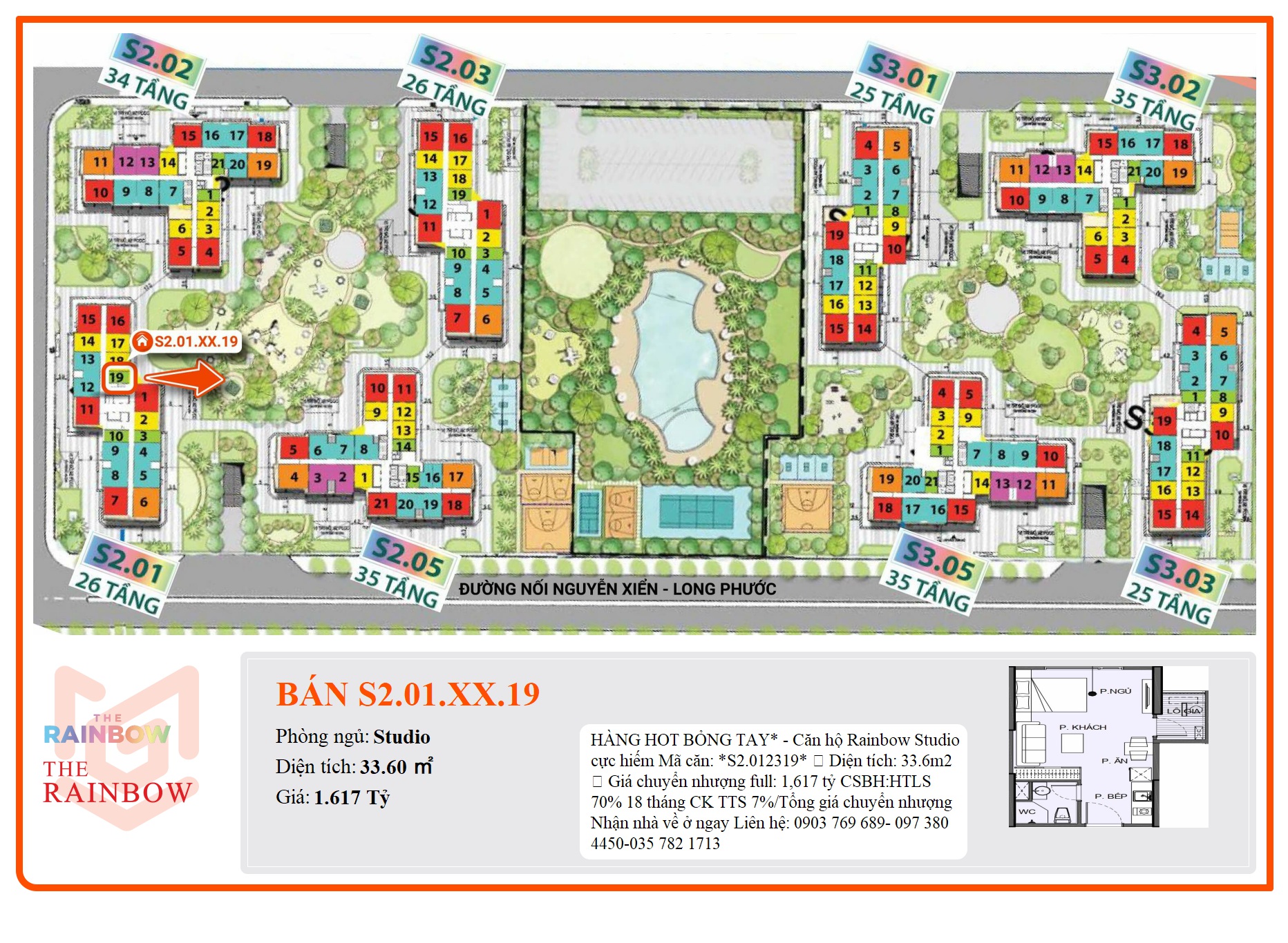 HÀNG HOT BỎNG TAY* - Căn hộ Rainbow Studio cực hiếm Mã căn: *S2.012319* ✅ Diện tích: 33.6m2 ✅ Giá chuyển nhượng full: 1,617 tỷ CSBH:HTLS 70% 18 tháng CK TTS 7%/Tổng giá chuyển nhượng Nhận nhà về ở ngay Liên hệ: 0903 769 689- 097 380 4450-035 782 1713
