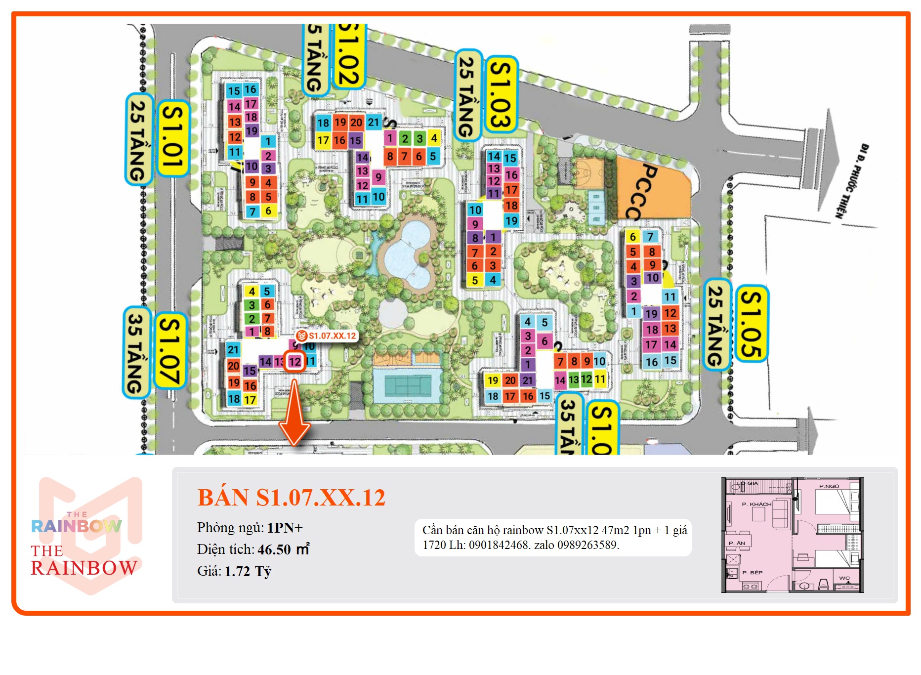 Cần bán căn hộ rainbow S1.07xx12 47m2 1pn + 1 giá 1720 Lh: 0901842468. zalo 0989263589.
