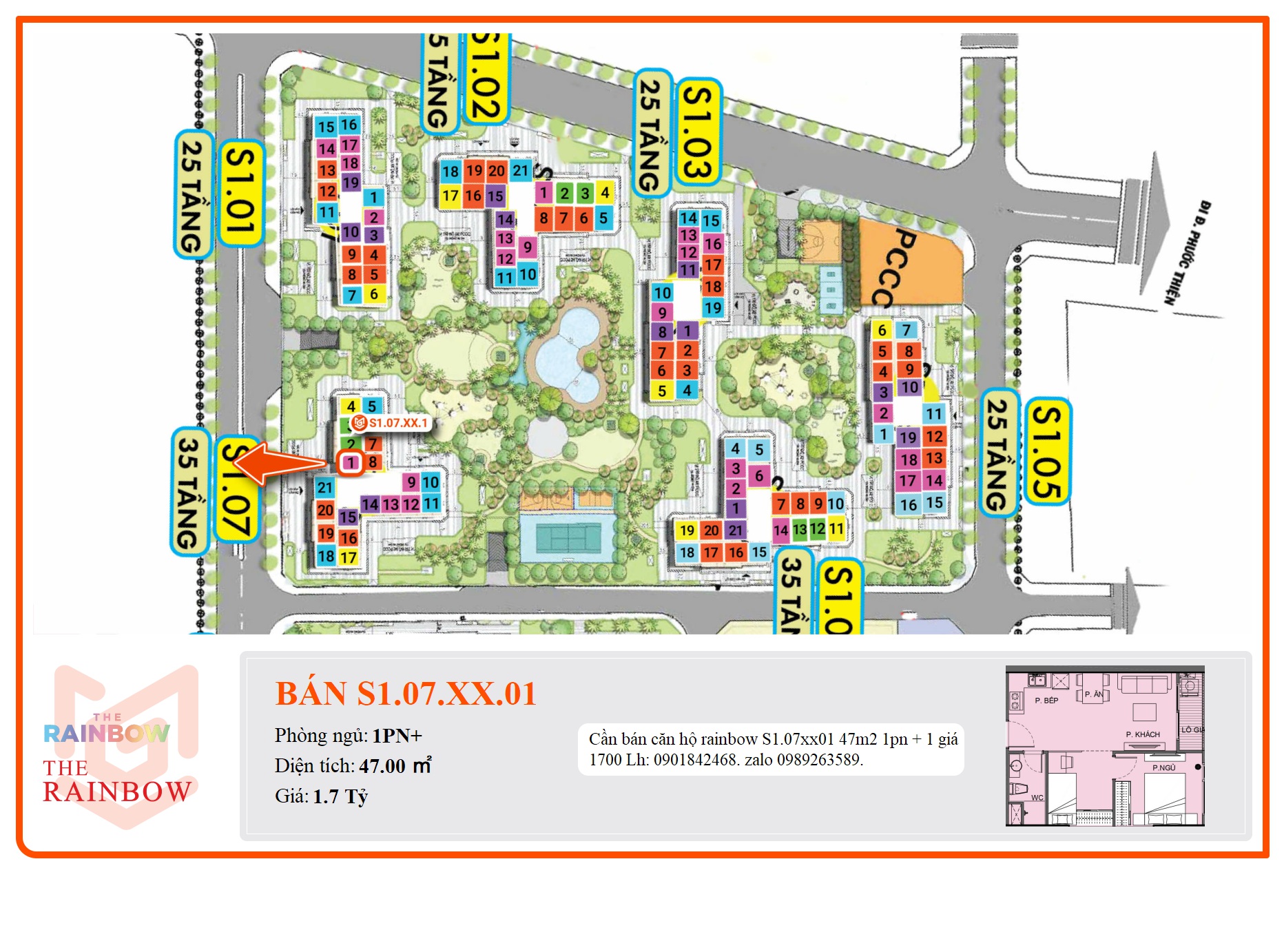 Cần bán căn hộ rainbow S1.07xx01 47m2 1pn + 1 giá 1700 Lh: 0901842468. zalo 0989263589.