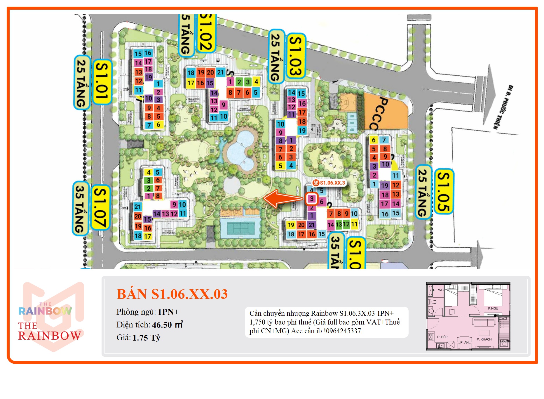 Cần chuyển nhượng Rainbow S1.06.3X.03 1PN+ 1,750 tỷ bao phí thuế (Giá full bao gồm VAT+Thuế phí CN+MG) Ace cần ib !0964245337.