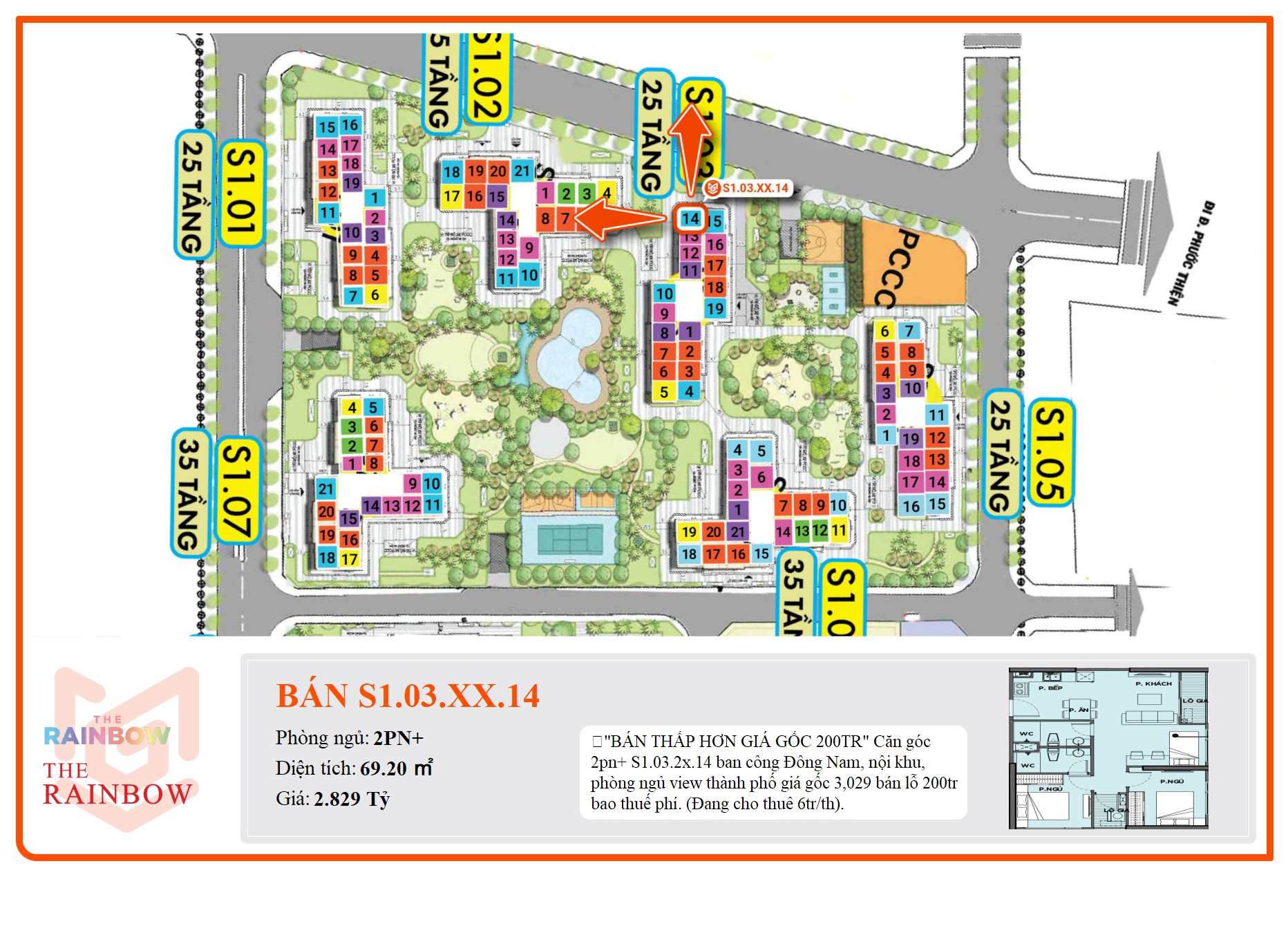 👉"BÁN THẤP HƠN GIÁ GỐC 200TR" Căn góc 2pn+ S1.03.2x.14 ban công Đông Nam, nội khu, phòng ngủ view thành phố giá gốc 3,029 bán lỗ 200tr bao thuế phí. (Đang cho thuê 6tr/th).