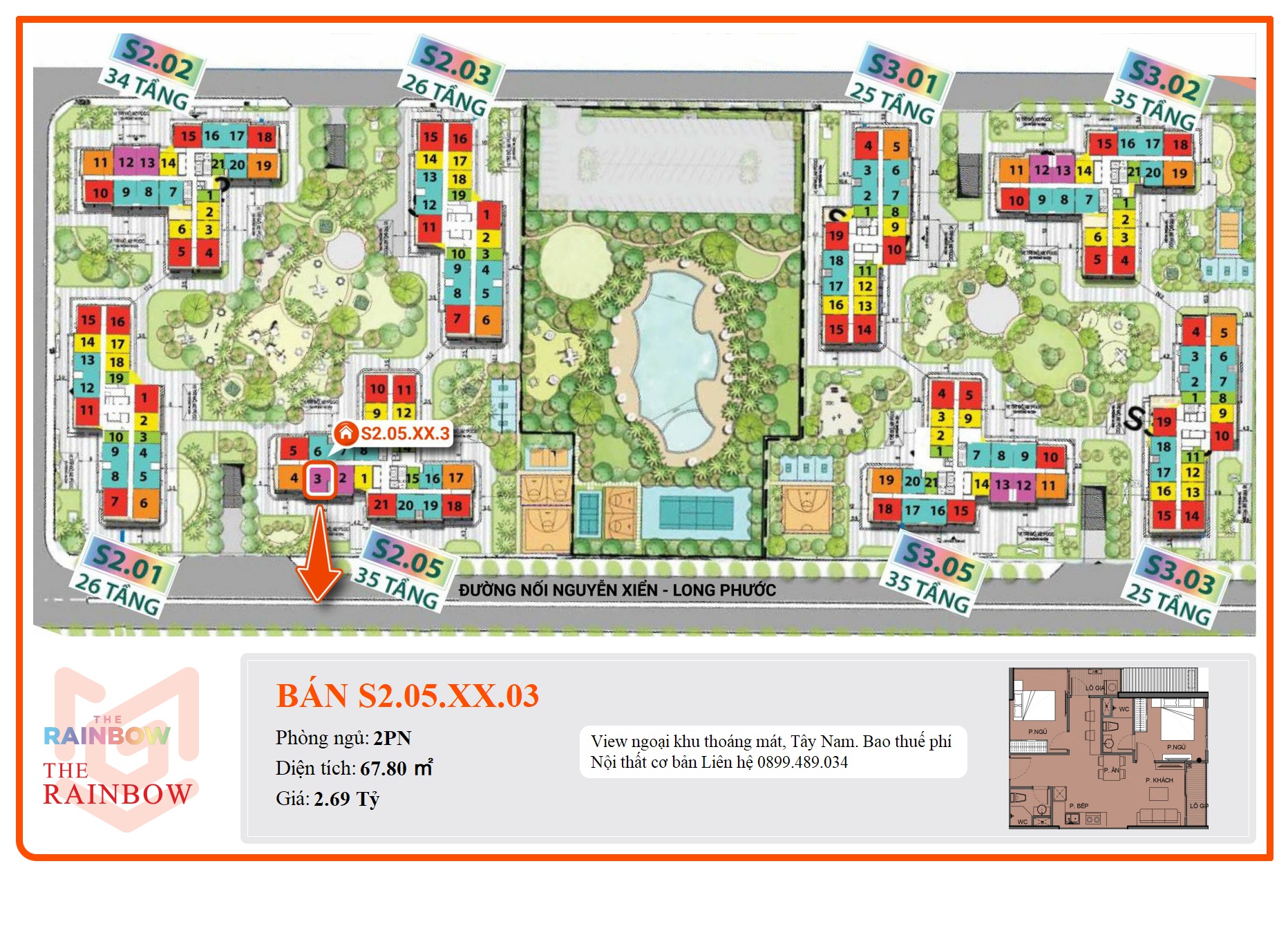 Phân khu The Rainbow thuộc đại đô thị Vinhomes Grand Park Quận 9 nằm ngay mặt tiền đường Nguyễn Xiển – Long Thạnh Mỹ – Quận 9. Khu vực này được xem là cửa ngõ phía Tây của đại đô thị này mang lai khả năng giao thông kết nối nhanh chóng, thuận tiện bởi lợi thế tiếp giáp trục đường Nguyễn Xiển; đường nội khu 30 – 20 – 13m và tuyến đường Vành đai 3 quan trọng của khu vực.