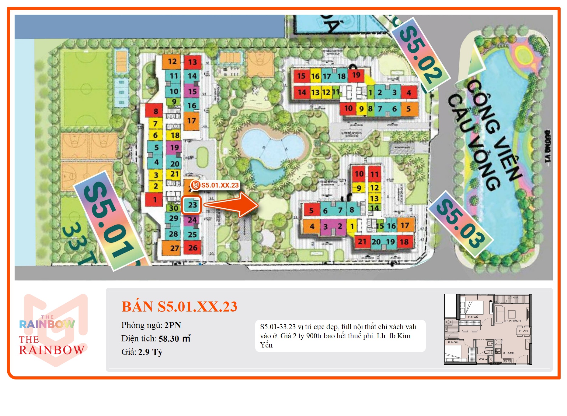 S5.01-33.23 vị trí cực đẹp, full nội thất chỉ xách vali vào ở. Giá 2 tỷ 900tr bao hết thuế phí. Lh: fb Kim Yến