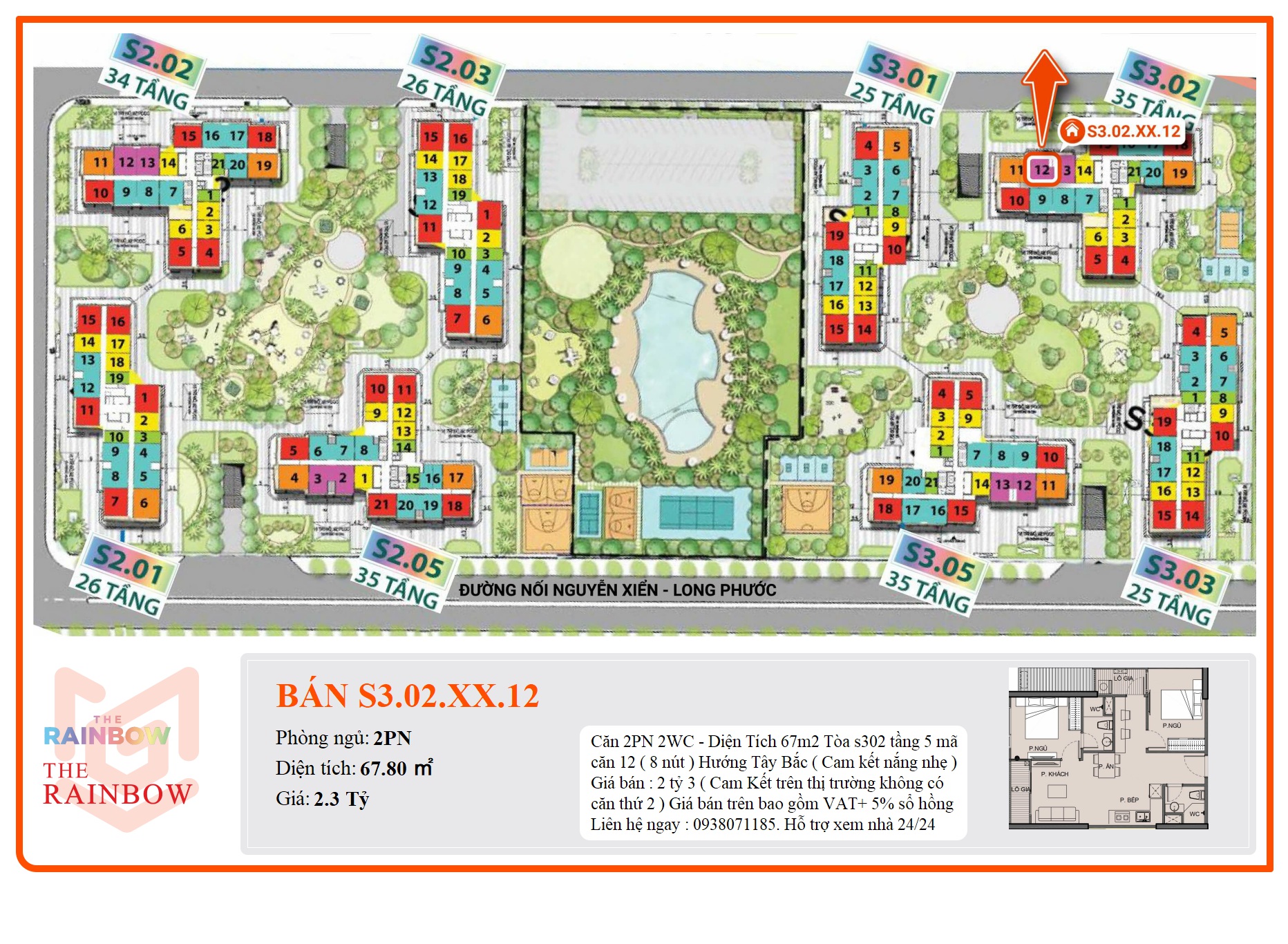 Căn 2PN 2WC - Diện Tích 67m2 Tòa s302 tầng 5 mã căn 12 ( 8 nút ) Hướng Tây Bắc ( Cam kết nắng nhẹ ) Giá bán : 2 tỷ 3 ( Cam Kết trên thị trường không có căn thứ 2 ) Giá bán trên bao gồm VAT+ 5% sổ hồng Liên hệ ngay : 0938071185. Hỗ trợ xem nhà 24/24