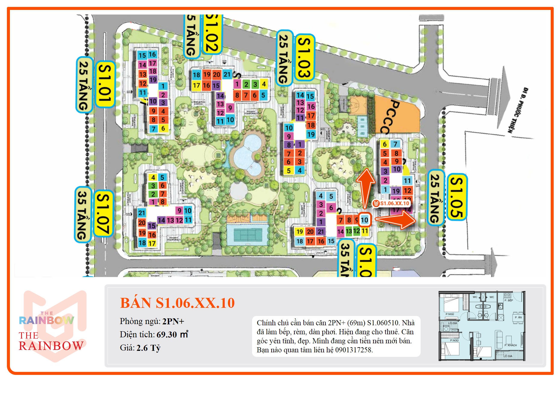 Chính chủ cần bán căn 2PN+ (69m) S1.060510. Nhà đã làm bếp, rèm, dàn phơi. Hiện đang cho thuê. Căn góc yên tĩnh, đẹp. Mình đang cần tiền nên mới bán. Bạn nào quan tâm liên hệ 0901317258.
