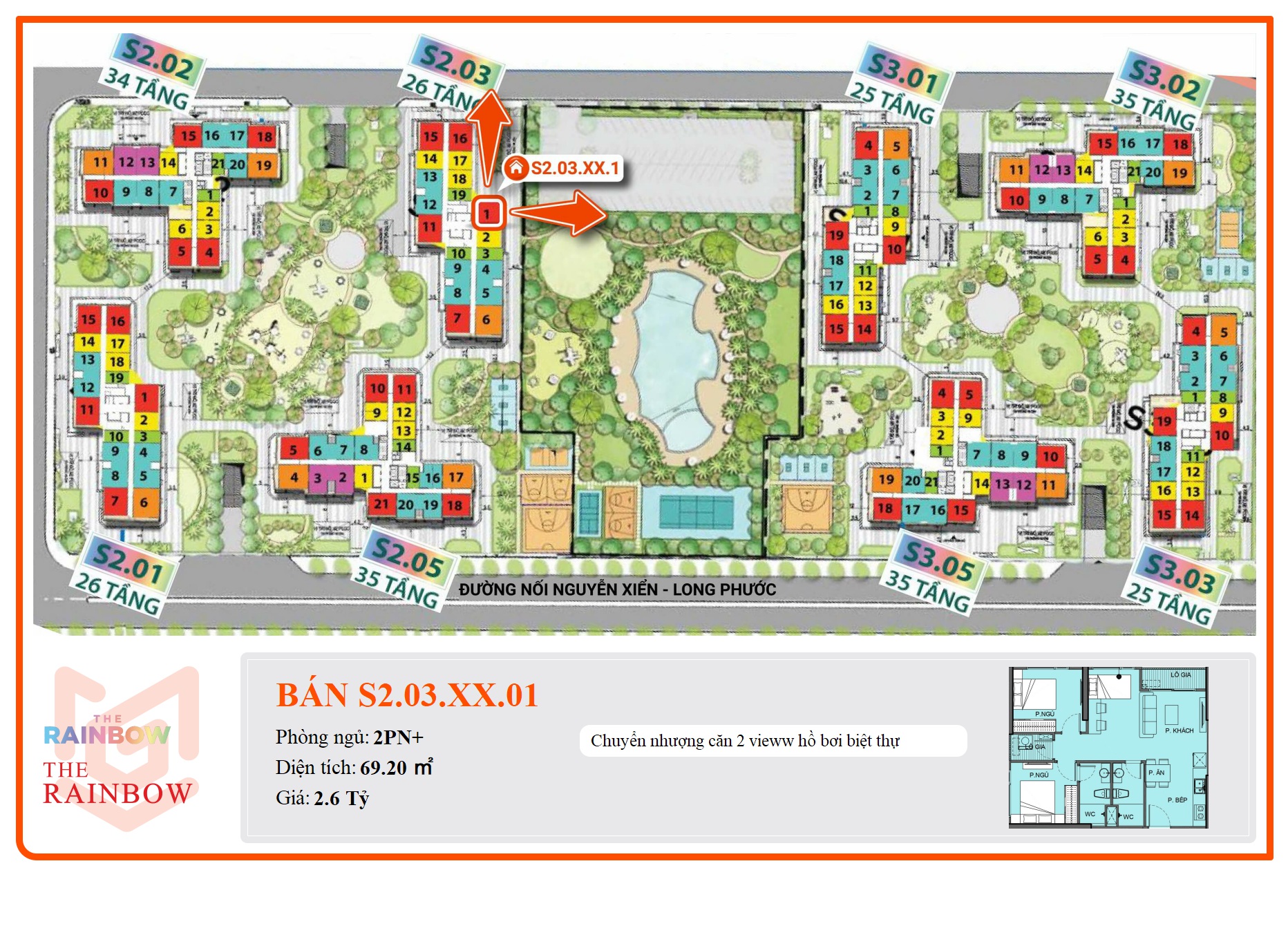 Phân khu The Rainbow có vị trí nằm ngay tại mặt tiền đường Nguyễn Xiển – phường Long Thạnh Mỹ – Quận 9 với quy mô 17 tòa tháp có chiều cao từ 25 – 35 tầng. Tổng số lượng căn hộ tại phân khu cung cấp cho thị trường 10,359 thuộc dòng sản phẩm Sapphire của thương hiệu Vinhomes. Các sản phẩm căn hộ tại nơi đây được thừa hưởng trọn vẹn môi trường sống ưu việt, trọn vẹn từ quy hoạch đồng bộ và sự quản lý vận hành thông minh. Các tòa tháp của phân khu được phân bổ, bố trí số lượng căn hộ như sau: