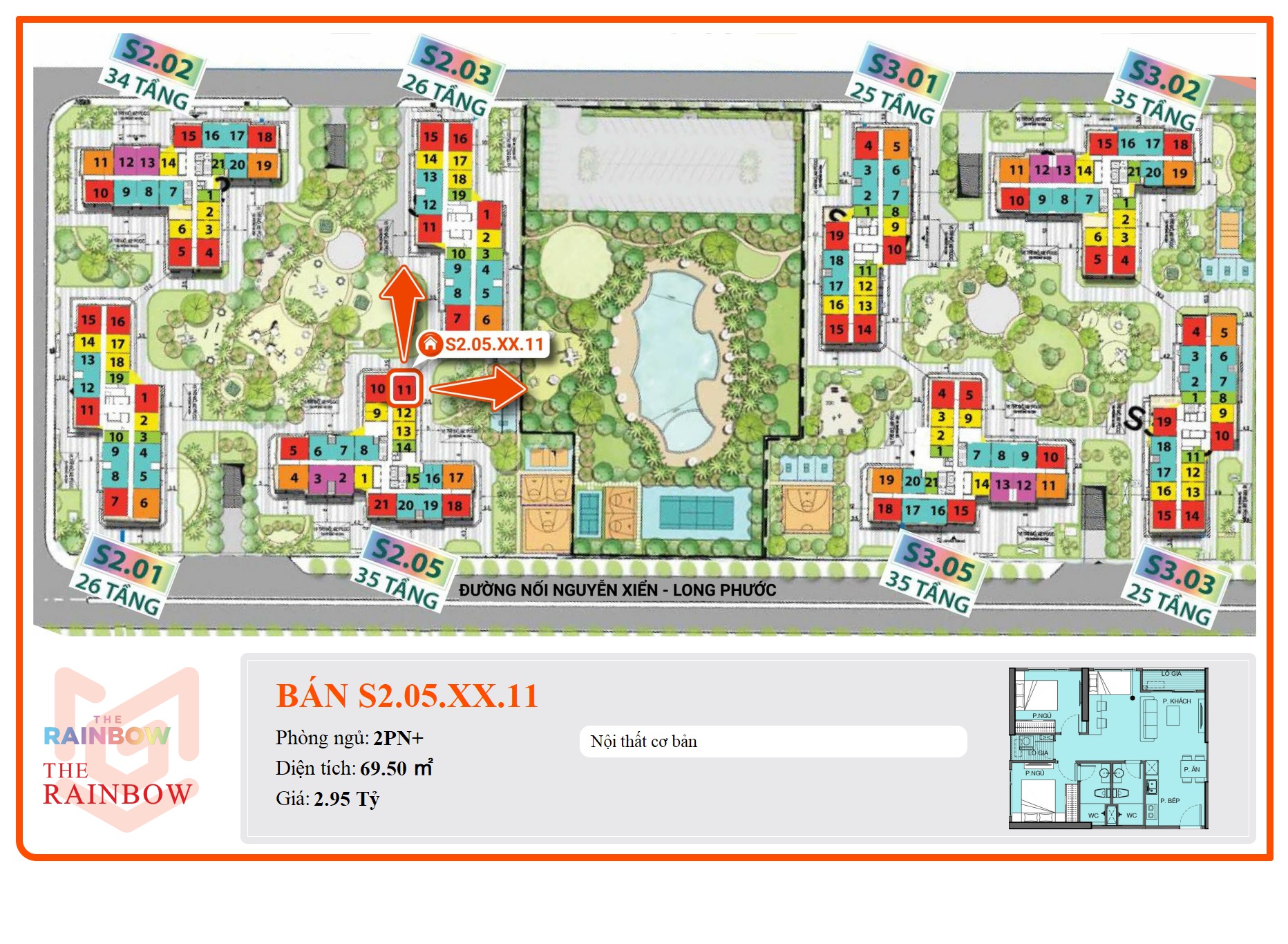 Phân khu The Rainbow có vị trí nằm ngay tại mặt tiền đường Nguyễn Xiển – phường Long Thạnh Mỹ – Quận 9 với quy mô 17 tòa tháp có chiều cao từ 25 – 35 tầng. Tổng số lượng căn hộ tại phân khu cung cấp cho thị trường 10,359 thuộc dòng sản phẩm Sapphire của thương hiệu Vinhomes. Các sản phẩm căn hộ tại nơi đây được thừa hưởng trọn vẹn môi trường sống ưu việt, trọn vẹn từ quy hoạch đồng bộ và sự quản lý vận hành thông minh. Các tòa tháp của phân khu được phân bổ, bố trí số lượng căn hộ như sau: